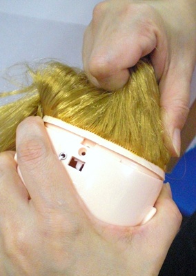 後頭部の小さなネジを外したら、髪の毛を束ねて、引き抜きます。